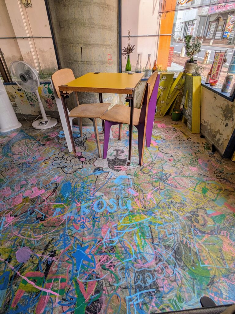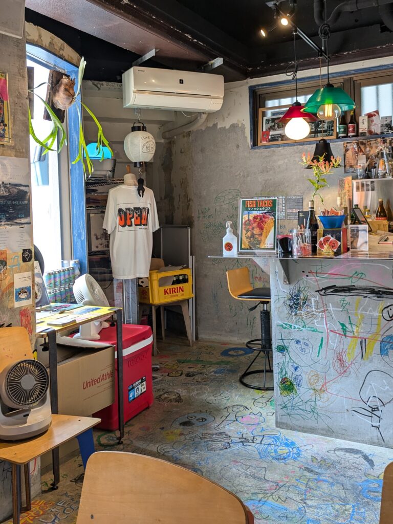 店内の壁や床は落書きともとれなくないアートがあり、たくさんの人がこの店に自分の痕跡を残していることを感じられる。